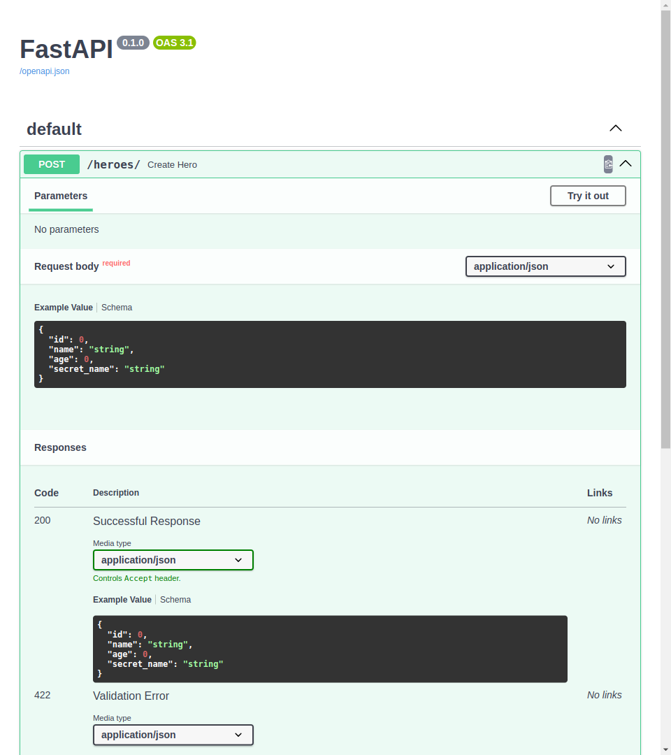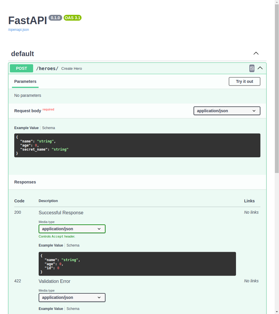 Если вы перейдете в пользовательский интерфейс API /docs, то вы увидите, что он был обновлен, и больше не принимает параметра id от клиента при создании нового героя, и т.д.